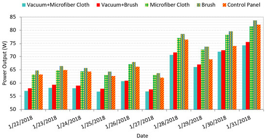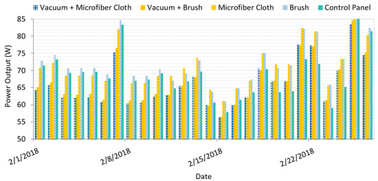 If the average of all cleaning techniques is considered, the improvement is about 0.5 W/day compared to the control panel. But this number is the average of all cleaning techniques and does not reflect the individual performances. When it comes to weekly cleaning, the performance improvements are more visible. Figure 5 shows the power outputs of the PV modules for the weekly cleaning cycle.