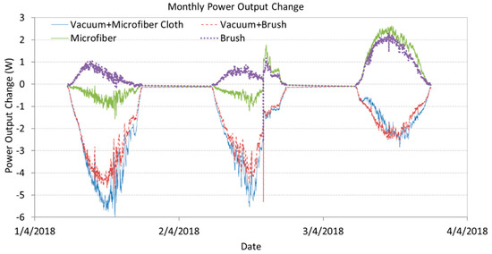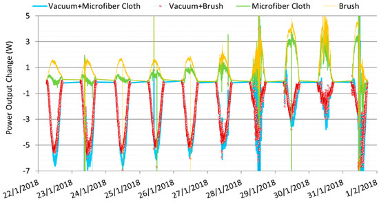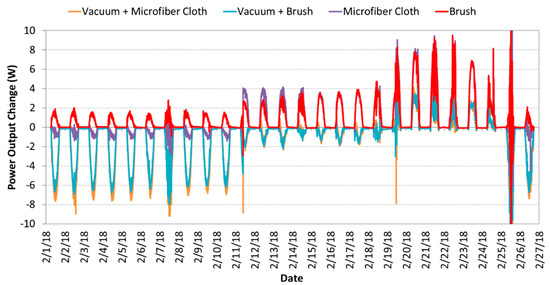 For weekly cleaning, Figure 6 depicts the changes in panel outputs, which are standardized. There are three improvements peaks occurring on the cleaning day of the week. In Figure 6, the red line (representing brush cleaning) jumped from ~1.47 W to ~2.5 W after the cleaning on 2 November 2018. This corresponds to an improvement of about 1 W per week. Similarly, it jumped from ~4.55 W to ~8.2 W on 19 February 2018. This corresponds to an improvement of about 3.65 W in two weeks. This increase is the result of cleaning the panel on that day. As the daily frequency, weekly cleaning can also achieve close to 0.5 W/day improvement (average of all cleaning methods) with respect to the control panel. This number can be higher when the cleaning methods are considered individually.