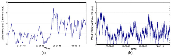 All of these parameters are already measured during the experiments. The wind speed measurements for daily and weekly cleaning phases are illustrated in Figure 8. The average wind speed was 2.556 m/s during the daily cleaning cycle, whereas the maximum wind speed was measured as 7.5 m/s as shown in Figure 8a. On the other hand, the average wind speed during weekly cleaning was 2.268 m/s, although the maximum wind speed reached to 7.4 m/s as shown in Figure 8b. Although there is wind speed data at 5-m height, in order to reflect the PV panel level, 2-m height is used.