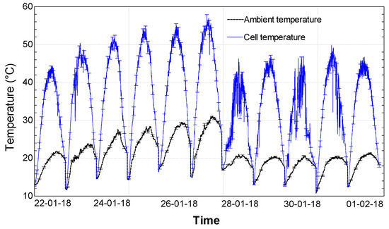 Variations of ambient and PV cell temperature during the weekly cleaning phase.