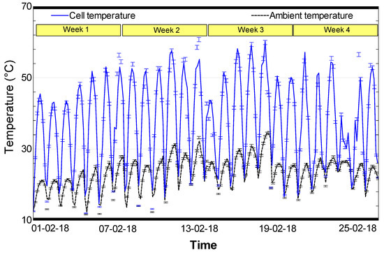 In February, when weekly cleanings were performed, the average ambient temperature was 23.23 °C. However, the PV cell temperatures reached up to 60 °C as shown in Figure 10. Soiling decreases light transmission over the PV glass, which reduces the cell temperature slightly. Therefore, just after the cleaning, higher cell temperatures were observed in general.