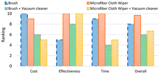 In this section, we rank the PV cleaning techniques employed in this study based on the cleaning efficiency, price, time and maintenance features as shown in Figure 11. The brush has the lowest cost and low maintenance of all cleaning methods. Nevertheless, the brush does not perform highly operative on the PV surface, mainly due to the brush being able to break the dust off the panel but not being able to wipe it off the panel. The dust particles can still remain on the surface unless not removed with extra force and time. It is also important to note that depending on the brush type, there can be scratches on the PV panel surface in case higher forces are applied. This can cause issues in the transmission of the light in the long-term. However, there are some detailed studies by Al Shehri et al. [28,29] in which they compared different type of brush materials including silicon rubber, nylon, and cloth. Their results implied that dry cleaning using nylon brushes did not have a significant, permanent effect on the optical characteristics of the glass surface, even when the brush was employed to clean a dusty surface.