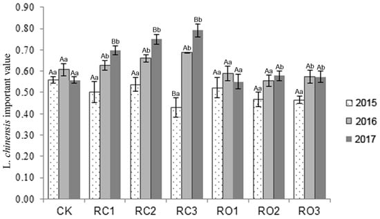 The importance values of L. chinensis in three years (2015–2017). For each year, significant differences (P < 0.05) among the seven treatments are indicated by uppercase letters (A, B). For each treatment, significant differences (P < 0.05) over the three years are indicated by lowercase letters (a, b).