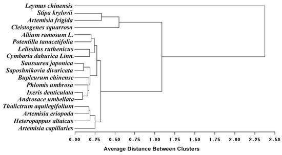 We created a cluster tree analysis by species IV for CK treatments in the year 2016 (Figure 3). As shown in the tree map, from 0.4–0.5 spaces, we divided it into the following four species groups: The first group was Leymus chinensis alone, the second group was Stipa krylovii and Artemisia frigida, the third group was Cleistogenes squarrosa, and the fourth group included all other species left, such as Cymbaria dahurica Linn, Phlomis umbrosa, and Heteropappus altaicus. As we know, Artemisia frigida is an indicator of grassland degradation, with an abundance of Artemisia frigida suggesting the grassland is in danger of degradation due to climate change and human activity [,]. With thousands of years of natural evolution, Leymus chinensis and Stipa krylovii have already become the most common species of the Inner Mongolia steppe.