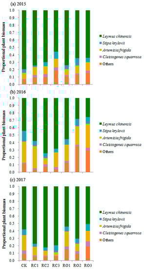 The presence of different species in a plant community shows biodiversity. We divided the plant species into five groups according to the cluster analysis: Leymus chinensis, Stipa krylovii, Artemisia frigida, Cleistogenes squarrosa, and others. We also measured the proportional biomass of different species in the community (Figure 4), with the results revealing that the proportion of Leymus chinensis increased significantly in RC treatments, especially in RC2. Accordingly, the proportion of Artemisia frigida and Cleistogenes squarrosa decreased, and Cleistogenes squarrosa reached a low of 0.01 in RC2 and RC3 in 2017 (Figure 4c). The proportion of Stipa krylovii increased with an increase of mineral fertilizer contents in 2015 and 2017 (Figure 4a,c). Thus, it can be concluded that mineral fertilizer improved Leymus chinensis and Stipa krylovii, but restrained the growth of Cleistogenes squarrosa. On the other hand, organic fertilizer was found to restrain the growth of Leymus chinensis, but enhance other plant species. In 2016, organic fertilizer obviously increased the proportion of Artemisia frigida and other species (Figure 4b), but returned to the distribution of 2015 in the following year (Figure 4c). This may mean that organic fertilizer tended to maintain a stable biodiversity balance. Overall, mineral fertilizer application enhanced the growth of the dominant species, Leymus chinensis, while organic fertilizer application improved more species, thereby maintaining biodiversity of the grassland.