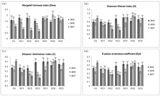 The biodiversity index over three years (2015–2017). (a) Margalef’s richness index; (b) the Shannon–Wiener diversity index; (c) Simpson’s dominance index; and (d) Pielou’s equitability index.