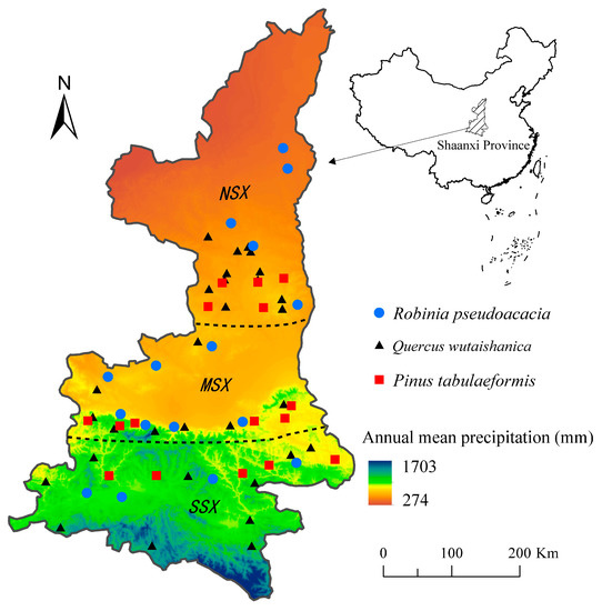This region can be divided into three natural areas in terms of its north–south geography and climate gradient: North Shaanxi (NSX), Guanzhong Plain (MSX), and South Shaanxi (SSX) (Figure 1). NSX is mainly covered by the Loess Plateau and the Maowusu desert and has a temperate arid climate, MSX is located in the center of Shaanxi and has a temperate humid climate, and SSX is mainly covered by the Qinling-Daba Mountains and has a subtropical humid climate. Accordingly, in this study, the MSX and SSX areas were considered to be the humid region, and NSX was treated as the dry region. Along the north–south climate gradient, the vegetation types in this region are: Temperate steppe, temperate forest and steppe, and warm temperate forest. Pinus tabulaeformis and Robinia pseudoacacia are the main afforestation species owing to their well-developed root system, drought tolerance, and high survival rate, and their carbon storage accounts for 50.4% of the total planted forest carbon storage in the region. The natural forests are composed mainly of the genus Quercus, in which Quercus wutaishanica is the dominant species and accounts for 63.0% of the total carbon storage of natural forests in the region [22]. Thus, Q. wutaishanica, R. pseudoacacia, and P. tabulaeformis forests were selected to model the NPP dynamics of forests undergoing climate change in the region. General information regarding the sampling sites is listed in Table 1.