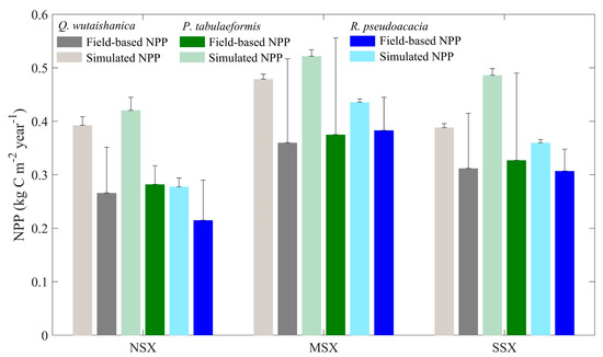 Comparison of field-based and simulated net primary productivity (NPP) values. NSX, MSX, and SSX are the northern, middle, and southern regions of Shaanxi province, respectively.