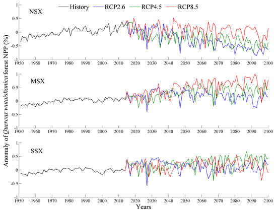 Changes in Q. wutaishanica forest NPP during historical (1951–2014) and future (2015–2100) periods using 1961–1990 as the base period. NSX, MSX, and SSX are the northern, middle, and southern regions of Shaanxi province, respectively.