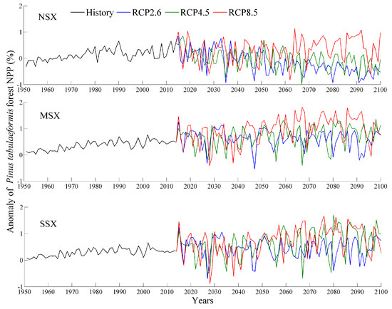Changes in P. tabulaeformis forest NPP during historical (1951–2014) and future (2015–2100) periods using 1961–1990 as the base period. NSX, MSX, and SSX are the northern, middle, and southern regions of Shaanxi province, respectively.