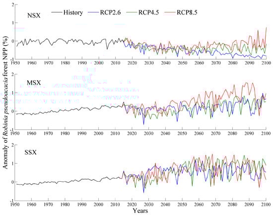 Changes in R. pseudoacacia forest NPP during historical (1951–2014) and future (2015–2100) periods using 1961–1990 as the base period. NSX, MSX, and SSX are the northern, middle, and southern regions of Shaanxi province, respectively.