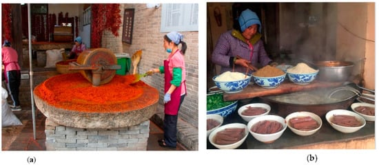 Food making: Foods are produced in traditional ways via using traditional material processing technics and selecting producers with traditional craftsmanship. For example, to make chili oil, locals use stone mills instead of machines to grind chili. In this regard, as the chili workshop owner (L-03) explained, “You would find that the surface of the chili processed by the machine is irregularly shaped under microscopes, and the edges are all quite sharp. However, the surface of the chili ground by a stone mill is smoother under the microscope. Although you can’t see it with your eyes, when you eat it, you will find that there is a huge difference in taste between them…. These are all the old stone mills I collected from the countryside. Some of them date back to the Qing Dynasty (1644–1912) and Republic of China period (1912–1949)”.