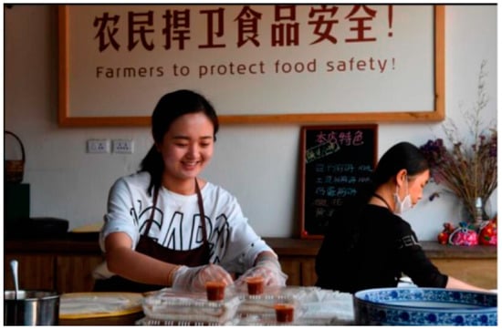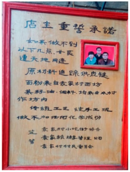 A moral self-discipline approach is also adopted. Food operators hang “vows” to promise the “authenticity” and safety of their snacks (Figure 4). “We didn’t require each snack bar to have an oath sign. At first, only one snack bar had an oath sign. Later, it was found that businesses with an oath sign attracted more customers, so now more snack bars hang vows” (L-04). Snack bar owners believe that the swearing on food safety would keep them in awe when making food. “The fact that I have taken such an oath shows that I have confidence in the quality of the food I make, and I believe that there will be a God watching over me, so I would not mess with the cooking process” (L-07). Such a self-discipline approach is regarded as effective in fixing the loopholes of other supervision systems to completely dispel tourists’ food safety concerns, reflecting the village’s slogan “Farmers to Protect Food Safety” (Figure 5).