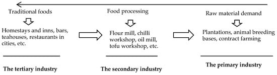 The reproduction of traditional foods and its success has contributed to the emergence of other forms of tourism businesses since 2012, such as homestays and inns, bars, teahouses, creative studios, and parent–child activities. Notably, thanks to its reputation formed via tourism development, the village has managed to open snack restaurants in cities such as Xi’an and Xianyang since 2015, catering to those urbanite consumers in a more convenient way, further extending its food value-chain. Meanwhile, it also helps to promote the development of agricultural products processing businesses, such as flour mills and spicy workshops. This further boosts the demand for high-quality raw materials of agricultural products, which results in the emergence of vegetable plantations, animal breeding bases, and so on, to supply the materials. As a result, the village has realized the integrated development path of “the tertiary industry” driving “the secondary industry” and promoting “the primary industry” (Figure 6), seeing an industry convergence that greatly diversifies opportunities for local development [39]. In short, within less than ten years, food heritagization has fostered observable economic sustainability for the village.