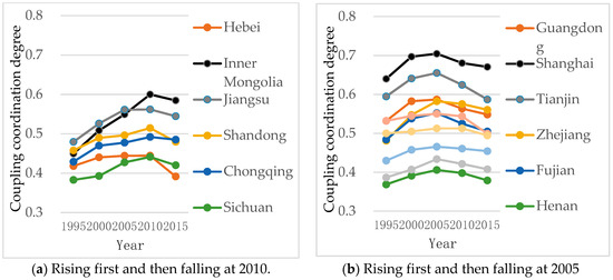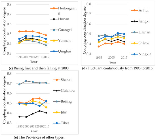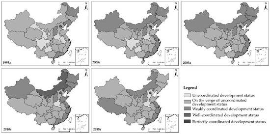 All the provinces studied are classified according to the classification criteria of the coupling coordination degree (Figure 2). The following points can be made. (1) Five provinces were in uncoordinated development status in 1995, but the count was reduced to 3, 1, and 1 in 2000, 2005, and 2010, respectively. However, the count went up to 3 again in 2015. Most of these provinces are located in the central and western regions of China with a relatively slow economic growth, among which Henan experienced the longest uncoordinated development status period. (2) In 1995, 19 provinces were on the verge of uncoordinated development status, accounting for 61.29% of all provinces. The distribution range of these provinces is relatively wide, and includes the central, western, and eastern coastal regions of China. The count was 16, 17, and 15 in 2000, 2005, and 2010, respectively, and most of these provinces are distributed in the central and western regions of China. In 2015, the count increased to 18, and most of the provinces were mainly distributed in the central, western, and northeast regions of China, except for Tibet. (3) In 1995, five provinces were in a weakly coordinated development status, and most of them were sporadically distributed in the eastern and northeastern regions of China. The count was 9, 10, 11 in 2000, 2005, and 2010, respectively, and most of these provinces were distributed in the northern and eastern coastal regions of China. In 2015, the count was reduced to 8, with most of these provinces distributed in the northern and eastern coastal regions of China. (4) In 1995, Beijing and Shanghai were in a well-coordinated development status. Tianjin joined them in 2000 and 2005, and Inner Mongolia joined them in 2010. However, only Beijing and Shanghai remained in this status in 2015. It is well-known that Beijing, Shanghai, and Tianjin are municipalities controlled directly by the Central Government. In particular, Beijing and Shanghai represent the political and financial center of China. (5) In 1995, 2000, 2005, 2010, and 2015, there was not any province in a perfectly coordinated development status.