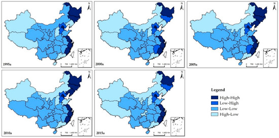 In this study, the representative years were selected, and a local spatial autocorrelation analysis of the coupling coordination degree was conducted. The local Moran’s I was statistically significant (p < 0.05). It can be seen from Figure 3 that the coupling coordination degree of various provinces in China displayed obvious spatial aggregation characteristics, including a strong spatial dependence and spatial heterogeneity. In 1995, 2000, 2005, 2010, and 2015, provinces characterized as “high-high” or “low-low” types were dominant, for which the count for the “high-high” type was 8, 7, 9, 9, and 7, respectively, and the count for the “low-low” type was 16, 15, 16, 16, and 14, respectively. Provinces characterized as “low-low” types displayed obvious aggregation characteristics. By contrast, the number of provinces characterized either as “low-high” or “high-low” types was relatively small, for which the count for the “low-high” type was 1, 3, 2, 1, and 2, respectively, and the count for the “high-low” type was 6, 6, 4, 5, and 8, respectively. Moreover, the number of provinces characterized as “high-low” types was slightly higher.