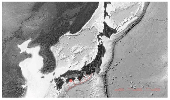 The shortest interval between earthquakes lasted 90 years, the longest was 200 years, and the average time between earthquakes was 100 to 150 years [,,,,]. The last Nankai 1854 megathrust earthquake covered the entire area of the fault and measured from 8.4 to 8.7 on the Richter scale (ML), depending on the source [,,,,], destroying 10,000 buildings and killing 3000 people. Tōnankai, with the epicenter in the central part, occurred 90 years later. It destroyed 30,000 buildings and killed over 1000 people. Two years later, in 1946, the Nankai-do, with its epicenter located in the southern part, followed. It destroyed almost 40,000 buildings and killed almost 1000 people. These last two measured 8.4 and 8.0, respectively, and yet were able to give rise to six-meter-tall tsunami waves (Table 1 and Table 2).
