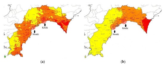 Kōchi is the largest but least populous of Shikoku’s four prefectures and is located on the south coast of the island. According to the latest estimates [,], during the next Nankai earthquake, 26 municipalities in the prefecture will suffer from level 6+ or 7 shocks, and the other 8 from level 6 shocks, with the maximum seismic activity lasting from two to three minutes (Figure 2). A rather conservative estimate issued in 2004 presumed that 15% of the built environment of the prefecture would be destroyed and 2.5% of the population injured immediately or within 24 h. Even considering the relatively low density of the area, this means the next Nankai earthquake will destroy 150,000 buildings, kill 10,000 people, hurt another 10,000, and force hundreds of thousands to evacuate [,].