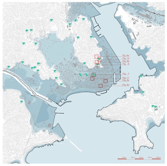 Susaki city: the old district and port. Existing evacuation points and the urban area at risk of flooding according to official data []. Position of figures marked red: Figure 6a. Typical street view: Figure 6b. Typical narrow passage: Figure 7. Evacuation tower: Figure 8. Evacuation hill: Figure 9a. Route toward the evacuation point: Figure 9b. Path from the evacuation point toward the north: Figure 10. Evacuation point: Figure 11. ChuChuman Cafe.