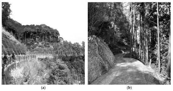 Susaki evacuation point: (a) route along Joyama Park leading from the evacuation hill (Figure 8) to the evacuation point (Figure 10). The path is 257 m long and too narrow for a standard ambulance to pass (photo by A. Porębska, February 2019). (b) Route from the evacuation point (Figure 10) toward the north (photo by A. Porębska, February 2019).