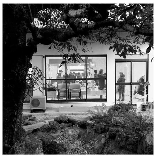 ChuChuman Cafe on Furuichi Street: the view from the backyard garden. As a result of the preliminary research held by the Diver-s-City lab, the University of Sassari, Italy, and the University of L’Aquila before the first PREPARe International Spring School, an abandoned building in the old hospital was successfully turned into a local community center and café, creating a new point for the future network of dual spaces (photo by A. Porębska, February 2019).