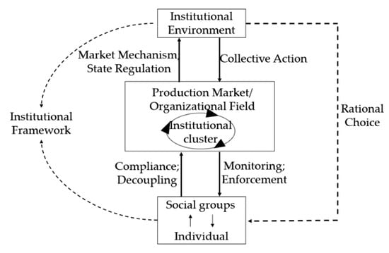 Based on Williamson’s framework, Nee [] puts forward the model for the new institutionalism in economic sociology. It builds the connections among micro-, meso- and macro-levels, allowing the macro institutional environments and microscopic individuals to interact with each other. Specifically, institutional environments at the macro level refer to formal institutions which are under the supervision and implementation of the state. It constrains organizational behaviors through market mechanisms and state management. The network mechanism of enterprises and markets lies at the meso level. Individual action mechanisms derived from social relations and sharing beliefs and norms lie at the micro level. Different from Williamson’s emphasis on governance, Nee’s model highlights the connected role of organizations. It also encompasses formal institutions in institutional environments and informal institutions embedded in social relations.