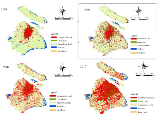 The LCT data, with a spatial resolution of 30 m, were obtained from remote sensing images by supervised classification [28]. In order to improve the accuracy of the classification results, the LCT data of Shanghai (Figure 2) from 2000, 2004, 2007, and 2015 were obtained through manual visual interpretation and corrected based on high-resolution Google Earth images. Field trips were also conducted when images could not clearly indicate land cover. LCT was classified into five types: Construction land (CL), green land (GL), wetland (WL), agricultural land (AL), and bare land (BL) (see Table 2).