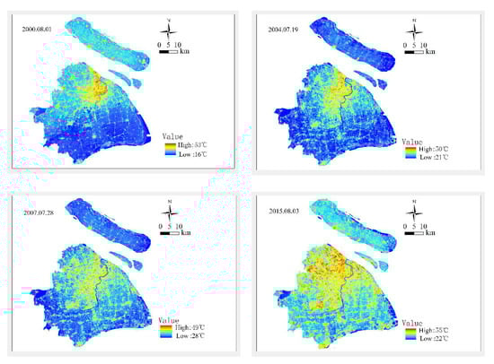 Based on the method in Section 2.2, the LSTs and temperature classifications of Shanghai in 2000, 2004, 2007, and 2015 were obtained (Figure 4). The LSTs of different LCTs were also calculated, as shown in Table 4.