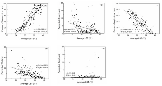 The linear fitting equation of average LST and PerCL is the best (y = 15.68x − 529.92, R2 = 0.81), indicating a significant positive correlation between them. CL has the greatest influence on LST. A large PerCL leads to high LST. Mean LST is significantly negatively correlated with PerAL (y = −12.44x + 491.11), PerBL (y = −0.93x + 37.71), and PerWL (y = −3.07x + 123.31). In other words, high PerAL, PerBL, or PerWL indicates low LST.