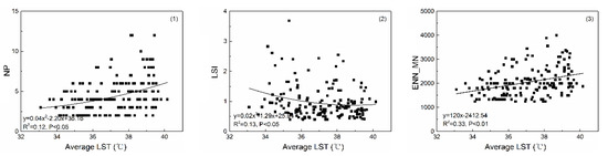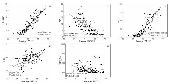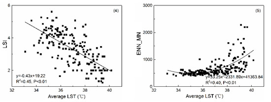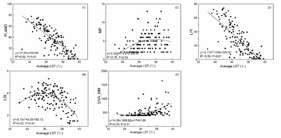 According to Figure 7, PLAND (y = 14.59x − 491.09) and LPI (y = 131x2 − 79.68x + 1189.93) of CL are well fitted to the LST curve (R2 > 0.80). NP (y = −2.65x + 104.95) and LSI (y = 0.34x − 8.57) have significant fitting with average LST.