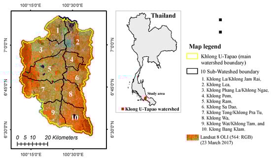 The study area is the Khlong U-Tapao watershed under the SLB consists of 10 sub-watersheds: Khlong Bang Klam, Khong Wa, Khong Wat/Khong Tam, Khong Pom, Khong La/Khong Jam Rai, Khong Tong/Khong Pra Tu, Khong Ram, Khong Phang La/Khong Ngae, Khong Lea and Khong Sa Dao. It covers area of 2406.04 km2 with 60 km length and 40 km width (Figure 1).