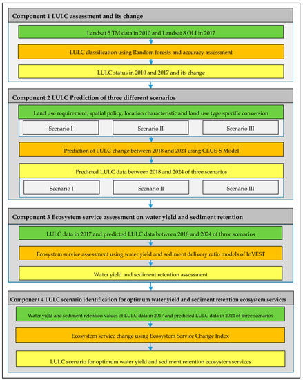 The research methodology workflow (input, process, and output) consisted of 4 components: (1) LULC assessment and its change; (2) LULC prediction of three different scenarios; (3) ecosystem service assessment on water yield and sediment retention; and (4) LULC scenario identification for optimum water yield and sediment retention ecosystem service (Figure 2). Details of each component were described in the following sections.