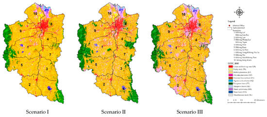 Spatial distribution of predictive LULC in 2024 of three different scenarios.