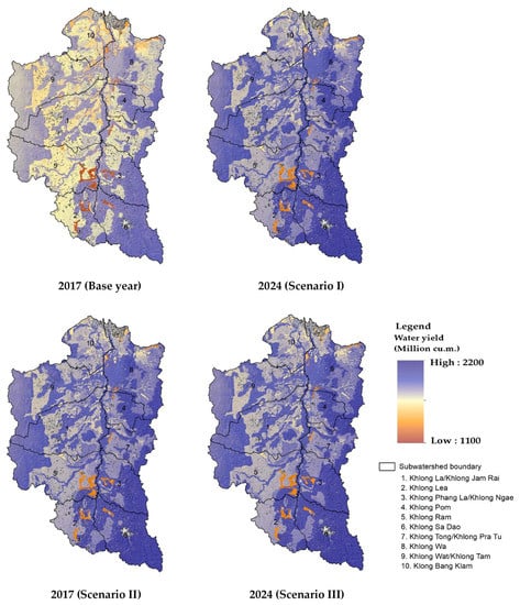 Based on LULC data in 2017, total water yield (runoff) was 1,863.80 mil. m3. Meanwhile, the predictive LULC data between 2018 and 2024 of Scenario I will generate the lowest average water yield than Scenario II and III with average value of 1,746.89 mil. m3 (Table 6). Since LULC of Scenario I does not represent dramatic LULC change. The contribution of each LULC type on water yield is insignificant. Herewith, major increasing LULC classes under this scenario were urban and built-up area, rubber plantation, oil palm plantation while minor decreasing LULC classes were paddy field, evergreen forest, marsh and swamp, and miscellaneous land. In contrast, LULC of Scenario II and III were predicted based on the transformation of government policy in forestry and agriculture, respectively. The contribution of LULC from Scenario II and III highly reflects on water yield (runoff) than Scenario I. Under Scenario II, major increasing LULC classes were urban and built-up area, oil palm plantation, and evergreen forest; major decreasing LULC classes were rubber plantation and miscellaneous land during 2018–2024. Likewise, major increasing LULC classes under Scenario III, were urban and built-up area and oil palm plantation, and decreasing LULC classes were rubber plantation and marsh and miscellaneous land in the same periods. Additionally, Scenario III will generate the highest annual water yield than Scenario I and II with an average value of 1,752.96 mil.m3 (Table 6). Spatial distribution of water yield in 2017 and 2024 of three different scenarios are displayed in Figure 5.