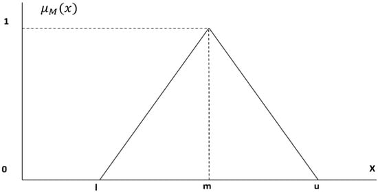 In the fuzzy AHP, the decision-maker fuzziness is expressed as a range of values, for which a triangular fuzzy number is often used. The triangular fuzzy number is composed of three values, (Figure 1). Here, and are the lower and upper limits of the membership function, and is the point where the center value of the fuzzy number , where .