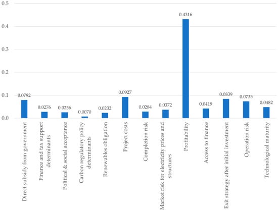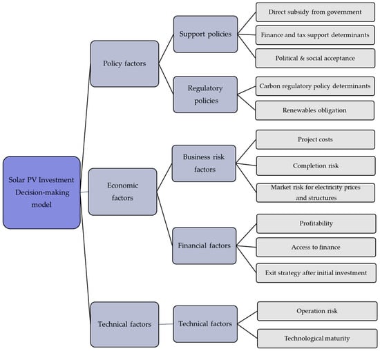 In this study, a structural hierarchy diagram was formulated as shown in Figure 3 by classifying the main factors considered for investment. There are three layers of evaluation indicators for investment in a solar PV power project. The first layer consists of three categories of indicators: policy factors, economic factors, and technical factors. The second layer consists of five sub-indicators of the first layer: support policies, regulatory policies, business risk factors, financial factors, and technical factors. The third layer consists of 13 sub-indicators of the second layer: direct subsidy from government [,,,,,], finance and tax support determinants [,,,,,,,], political & social acceptance [,,,,,,,,,], carbon regulatory policy determinants [,,,,], renewables obligation [,,,], project costs [,,,,,,,], completion risk [,,,], market risk for electricity prices and structures [,,,], profitability [,,,,], access to finance [,,,,,], exit strategy after initial investment, operation risk [,,,,,], and technological maturity [,,,].