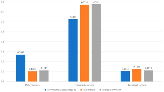 The groups showed considerable differences in the perception of the sub-factors of economic factors. Power generation companies showed different results from the other two stakeholder groups. The financial investors and researchers assigned higher importance to financial factors than business factors, which coincided with the integrated analysis results shown in Figure 4. This reflects the characteristic of financial investors who invest for profits. The power generation companies assigned higher importance to business factors than other stakeholders because they must have a certain power generation capacity to meet regulatory and power production needs. The researchers fell between the other two groups. These differences in the perception of policy factors and economic factors among the three groups are analyzed in more detail by comparing the importance values for the third layers (Figure 8).