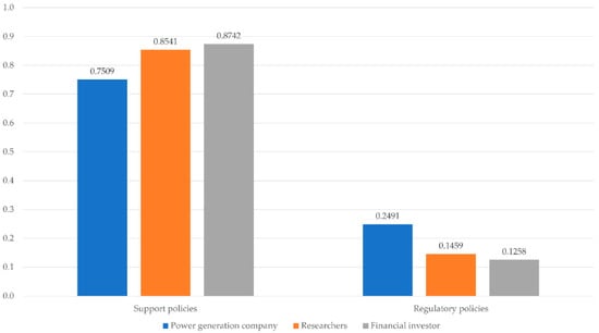 A higher weight was assigned to the support policies than the regulatory policies for all three groups. This is the same as the result of the integrated analysis and proves that support policies have a greater effect on the economic value of projects than regulatory policies. Power generation companies assigned a higher weight to regulatory policies than other stakeholders because they are more directly affected by the regulatory policies of the government. Figure 7 shows the results for the economic factors by stakeholder group.