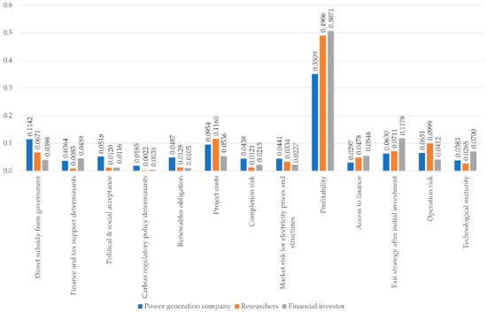 Power generation companies, which must carry out the entire process from the initial investment stage to the operation of power plants, assigned a lower weight to the profitability indicator because they bear a higher project risk burden than other stakeholders. Power generation companies (4.38%) also assigned much higher importance to the completion risk than other stakeholders (1.21%, 2.15%) because they are the ones who are responsible for receiving licenses for construction and are aware of the fact that many interruptions in construction may be caused by civil complaints and other problems. As a result, they assigned higher importance to the completion risk indicator than other stakeholders. Recently, the construction of solar PV power plants has often been interrupted and delayed due to many civil complaints in the license and operation process by the destruction of facilities. Power generation companies perceive the risks from these factors to be more important. Power generation companies assigned a higher weight to policy factors such as political & social acceptance, carbon regulatory policy determinants, and renewable obligation than other stakeholders because they are more directly affected by the regulatory policies of the government. For power generation companies, political & social acceptance, carbon regulatory policy determinants, and renewable obligation showed the weight values of 5.18%, 1.85%, and 4.87%, respectively. For researchers, the values were 1.20%, 0.22%, and 1.28%, and for financial investors, the values were 1.16%, 0.35%, and 1.05%, respectively. Financial investors (5.36%) and power generation companies (9.54%) assigned lower importance to the project costs than researchers (11.60%) because it has become easier to predict cost overrun and schedule overrun with the accumulation of previous investment experiences in solar PV projects.