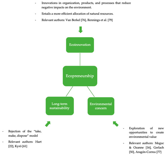 A new stream of research has recently appeared in the entrepreneurship literature. This new stream of research explores corporate strategies that focus on the environmental dimension [5]. This focus does not overlook other dimensions (social and economic). However, priority is given to addressing the effect of the negative externalities of firms’ economic activity on these firms’ immediate surroundings. The goal is, therefore, to build a business model that is sustainable in the long run [6,7]. Ecopreneurship and the ecological sector contribute to achieving this goal. The concept of ecopreneurship is based on three pillars: innovation, caring for the environment, and long-term sustainability [8].