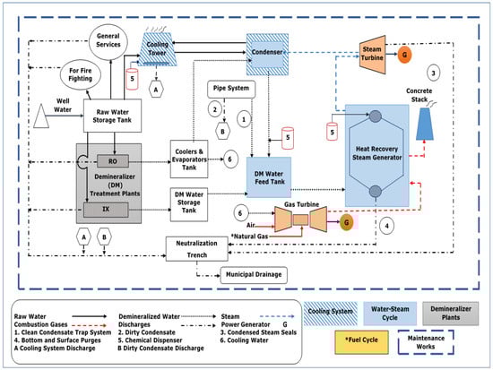 Two types of water quality are used in this process: demineralized water—which circulates through the HRSG and condenser (water–steam cycle)—and well water, which circulates through the condenser and cooling tower (cooling system).