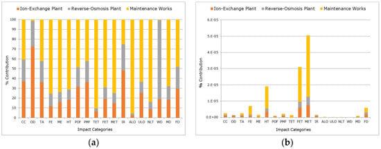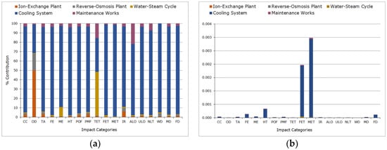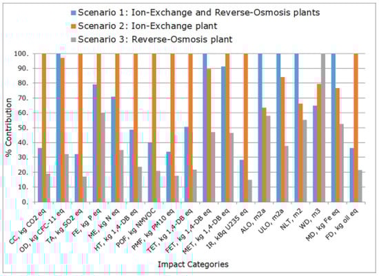 Our results showed that most affected categories were related to water and toxicity to the environment and living organisms. Water depletion (9.77 × 10−1 m3/MWh) was caused mainly by the high volume of water consumption in the cooling systems and the reverse osmosis process; ecotoxicity—freshwater (8.49 × 10−3 kg 1,4-DB eq/MWh), marine (7.35 × 10−3 kg 1,4-DB eq/MWh), and terrestrial (4.92 × 10−5 kg 1,4-DB eq/MWh)—and human toxicity (1.1 × 10−1 kg 1,4-DB eq/MWh) were due to the manufacture and consumption of the chemicals used.