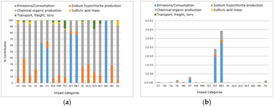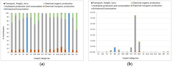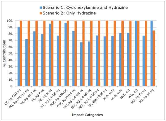The allocation of the materials was performed according to the mass of the substances involved in the process. Low-consumption materials were excluded, except for hydrazine, which, despite its low consumption (0.04 m3/month, at 35%), it is extremely toxic [] and thus was included. A 1% cut-off criteria—or the amount of matter flow associated with the unitary processes excluded from the calculation in the study []—was considered for the evaluation.