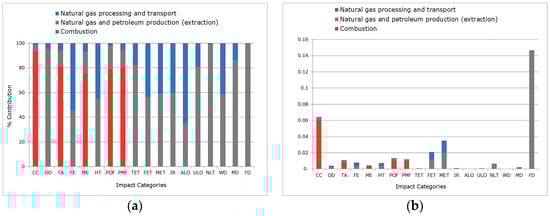 Agrawal et al. [] carried out an LCA on a CCGT plant to identify the midpoint (problem-oriented) and endpoint (damage-oriented) impacts. The LCA included the processes within the power plant boundary (electricity, water usage, natural gas combustion, wastewater disposal, etc.), and it also considered upstream processes, such as extraction, natural gas processing, and transportation.