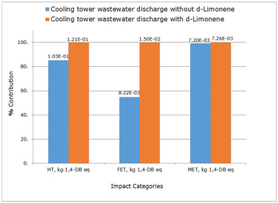 Figure 12a shows that the impact of d-Limonene to HT, FET, and MET that had been detected in the sensitivity analysis is still present when considering the IX, RO, water–steam cycle, cooling system, and maintenance work stages in the evaluation of the electricity generation process.