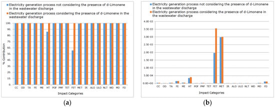 Life Cycle Assessment (LCA) of the electricity generation process considering initial operating conditions vs. considering also the presence of d-Limonene in the wastewater discharge: (a) characterization; (b) normalization.