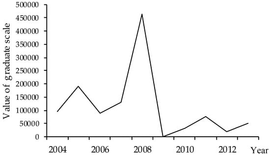 As indicated in Figure 2, the graduate scale between 2004 and 2008 presented a wavelike rising trend from 93,829 in 2004 to 464,123 in 2008, implying that the impact of graduates on human resources in the Hubei province became increasingly significant. Notably, in 2009, the number of employees in both secondary and tertiary industries increased rapidly, while the number of graduates decreased by 8396, resulting in the most significant weakening of the graduates’ impact on human resources. The 2008–2009 Chinese economic stimulus program was carried out by the State Council of China to explain this phenomenon in a certain extent. On November 2008, the Chinese government announced a RMB¥ 4 trillion stimulus package as an attempt to minimize the impact of the global financial crisis on the economy. This program brought increasing investment in key areas such as housing, rural infrastructure, transportation, and disaster rebuilding, which, consequently, supplied quantity of labour-intensive occupations and helped transform lots of farmers into construction workers. At the same time, many university students chose to pursue further education in graduate schools due to the fact that the financial crisis made it difficult for them to find optimal jobs. This reduced the numbers of graduates during the period of the financial crisis. Further, the Regulations on adjusting the enrolment plan for vocational schools released in 2006 greatly reduced the enrolment rate in vocational schools, partly accounting for the shrinkage of the numbers of graduates in 2009. After the financial crisis, the graduate scale then began to increase from 30,553 in 2010 to 51,478 in 2013.
