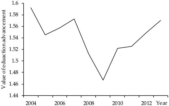 As shown in Figure 3, the education advancement level presents a tendency toward a decrease, followed by increase: from 2004 to 2005, the education advancement level declined from 1.592 to 1.545 due to the rapid increase in the number of vocational school graduates. After the policy of enrolment structure adjustment was introduced in 2006, the education advancement level increased slightly. However, from 2007 to 2009, China began to launch the reform in the higher education system, and the school years of masters students have gradually changed from two years to three years. This reduced the numbers of postgraduates. Therefore, during this period, the value of education advancement dropped again and fell to its valley value (1.467) in 2009. Since 2010, the level of educational advancement has gradually increased from 1.522 to 1.570 in 2013.