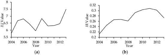Industrial structure evolution in the Hubei Province from 2004 to 2013. (a) Value of industrial structure upgrading; (b) value of industrial structure rationalisation.