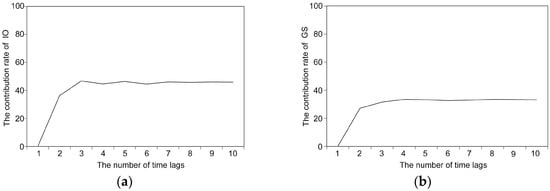 As shown in Figure 9, the contribution rate of innovation outputs (IO) to industrial structure rationalisation (IR) was above 40%, reaching its maximum value in three years, fluctuating slightly in the fourth, fifth, and sixth years, then staying comparatively stable during the later periods. The contribution rate of graduate scale (GS) to industrial structure rationalisation (IR) was above 30%. It appears that the contribution of graduate scale (GS) to industrial structure rationalisation (IR) was weaker than that of the innovation outputs (IO).